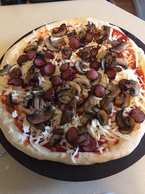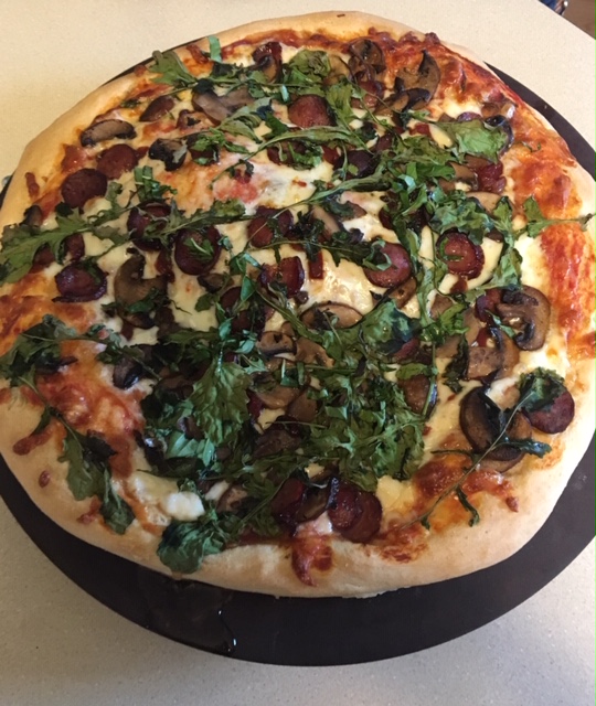 Sauté the kielbasa until browned on the edges, then add the sliced mushrooms to the pan until they’re about half their original size. Top the pizza with about 1 cup of the pizza sauce, then shredded cheese, then the mushroom-sausage mixture, then arugula. Bake as directed.