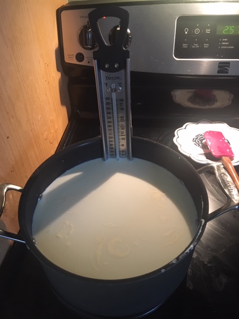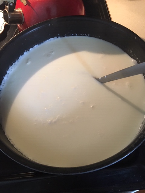 - In a large pot (6 quart or larger), heat milk to 180-185 degrees over medium heat, stirring frequently. If the milk begins to stick to the bottom of the pan, lower the temperature and stir more frequently. Note: If you’re starting with cold milk, this process can take up to an hour to do properly because, unlike boiling water, you do NOT want to heat milk too quickly, lest you get burned milk chunks on the bottom of your pan and unevenly heated milk. Take your time with this step. However, browned milk will not prevent ricotta from happening; it’s just not great eats.