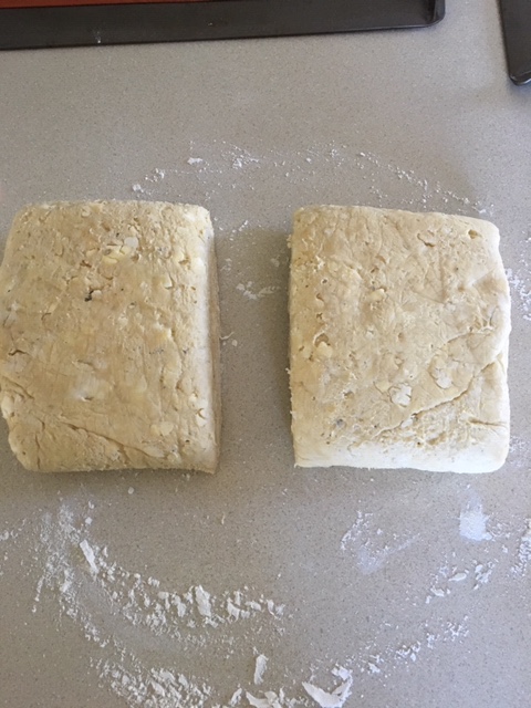 Step 1: Cut dough square into two even pieces, like so: