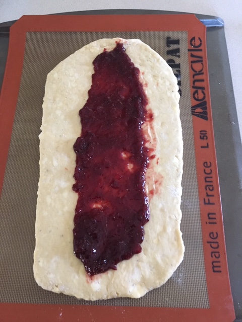 Step 3: Place each dough on a baking sheet lined with parchment paper or a Silpat. Spread half of the jam down the middle of each dough, making sure to leave a couple of inches of space on both sides and an inch or so at the top and bottom:
