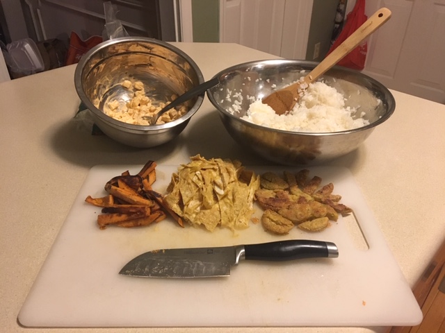Pictured are our spicy tofu filling, sushi rice, sauteed sweet potato, tamago strips, and fried green tomato strips.