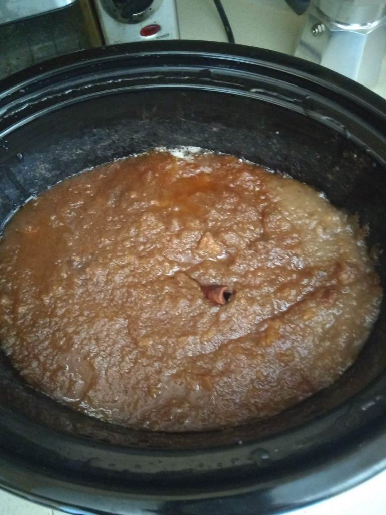 I said fruit jam was easy. Apple butter is even easier – the hardest part is peeling, coring, and cutting the apples in preparation, which is made more enjoyable by listening to something fun (I went with a spooky podcast this time around, because almost fall) and becomes rather meditative after a few apples. The processing itself is simple – I use a slow cooker and the recipe gives directions for that route, but you can also cook the apples on the stovetop and even bake the apples if you don’t have a slow cooker – you’ll just need to add more liquid to make sure the mixture doesn’t dry out.