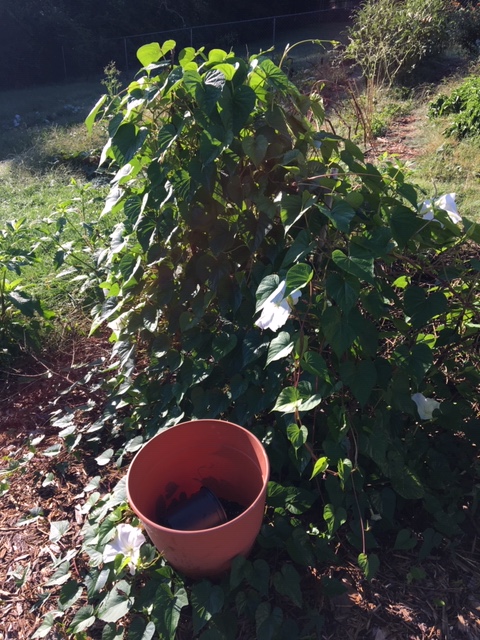 We let the morning glories flourish far away from our vegetable garden, because they’re pretty.