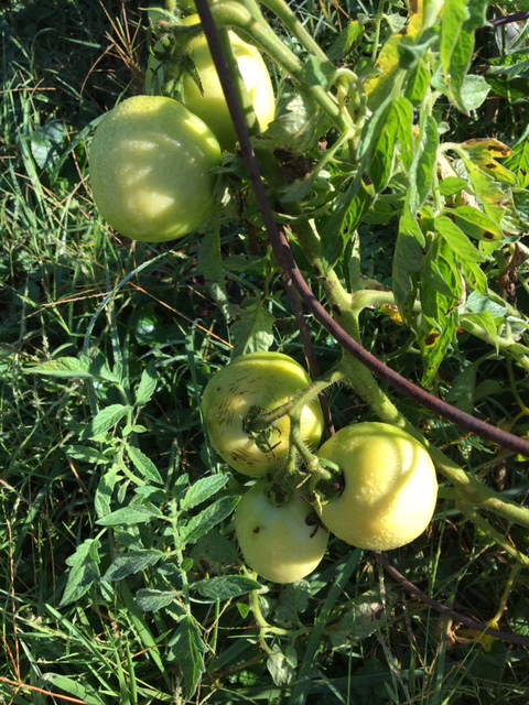 The free tomato plants we nabbed from the nearby garden store are exploding now! They turn bright orange when ripe.