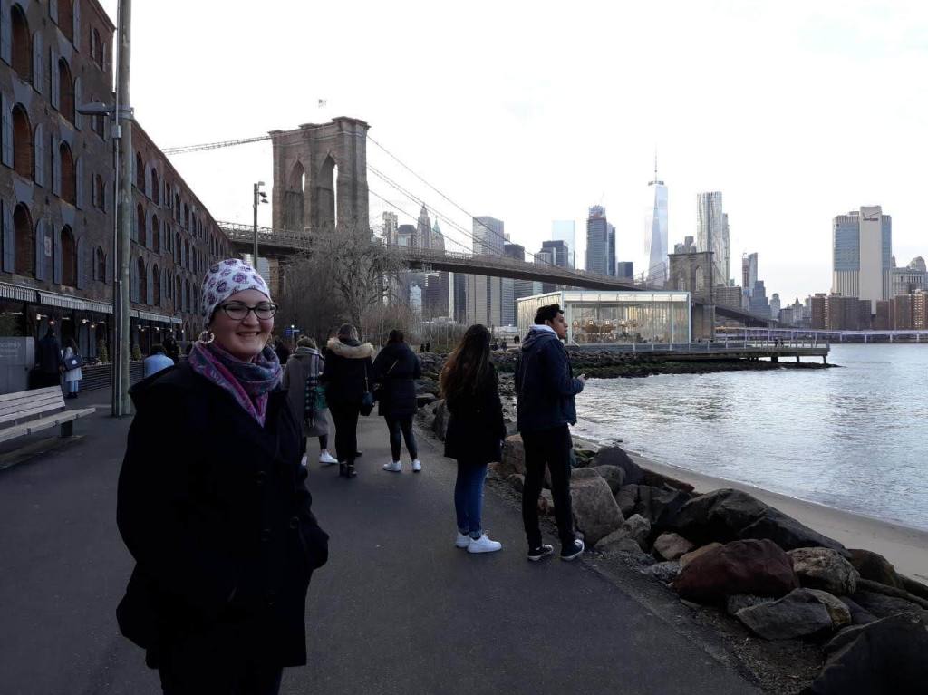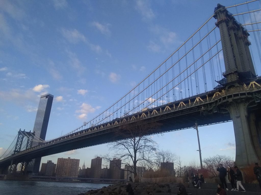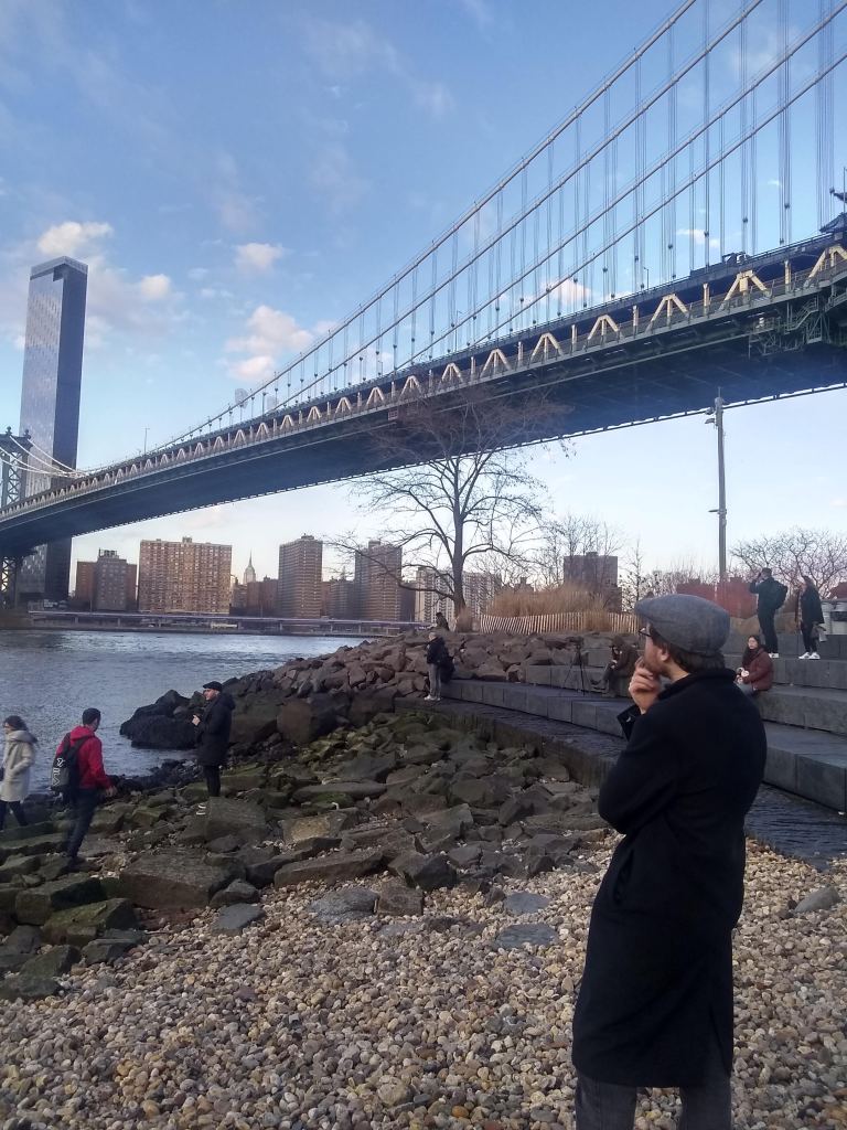 Hangries over, we walked outside to a gorgeous view of the Brooklyn Bridge and the riverside right near sunset (completely unplanned magic hour, anyone?) and read many a plaque, as is husband’s wont. It was a peaceful break from the hustle and bustle of the last several days, just taking in the sights and people by the river for a half hour or so.