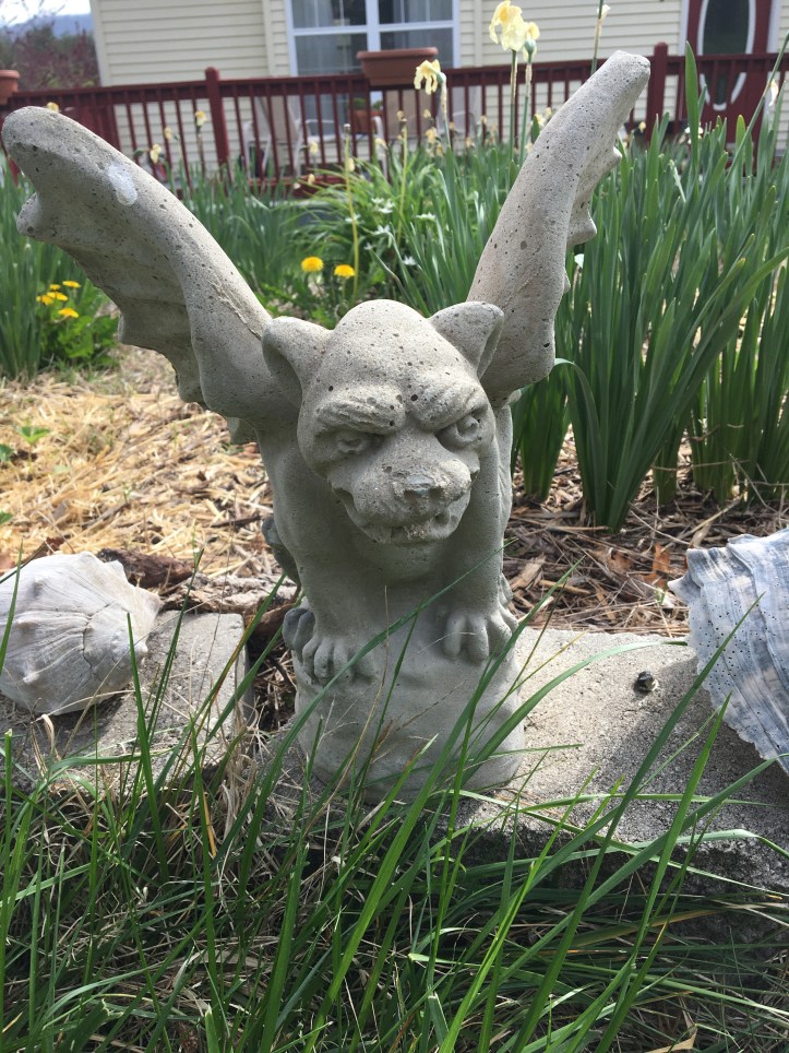 Strawberries! The first is a new one in the bed that started from crowns, and the second is a volunteer plant from last year’s crowns. Yay! The third is our gargoyle, who keeps the hooligans out of our strawberries. Keep up the good work, Gargy!