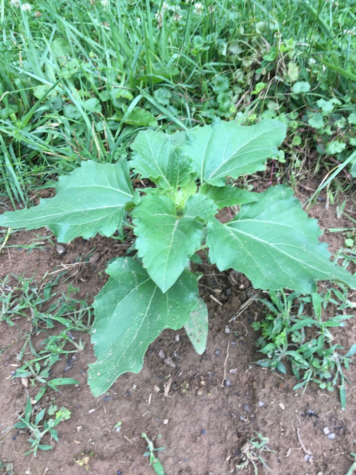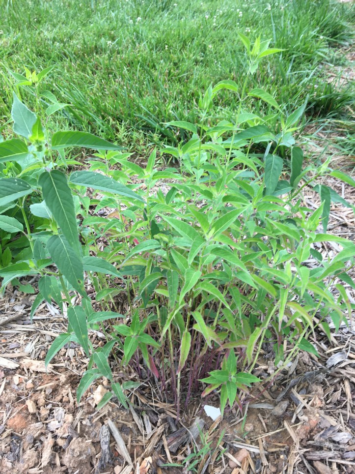 There’s more to the garden than is pictured (including the pedestal of a new gazing ball – thanks, in-laws!), but these are probably the most exciting things growing as yet that haven’t already been pictured: a daisy that’s over two, maybe three feet tall that I got on sale last year, borage back in action, bushy bee balm, and one of the moon flower sprouts that’s growing its gorgeous heart-shaped true leaves (which are apparently delicious to something out there)!