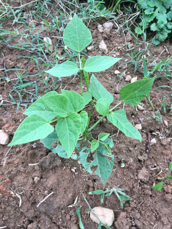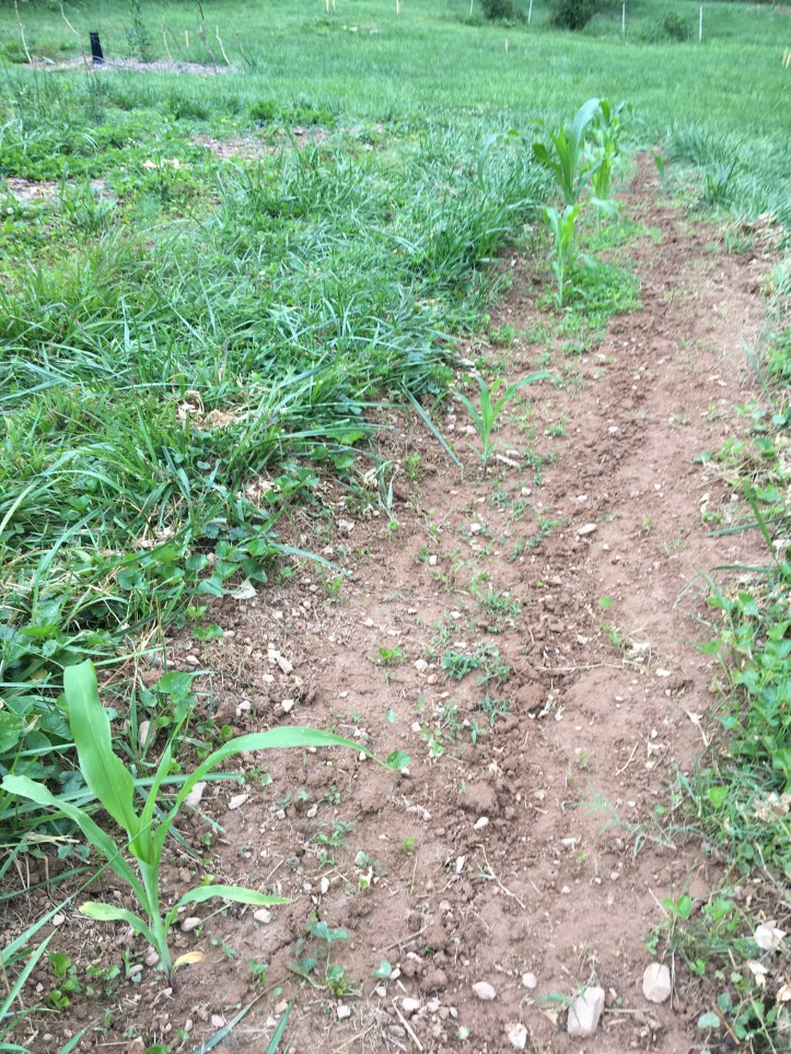 Ah, Row 6, the three sisters row. Right now, there’s corn down the line (of different sizes due to some wonky soil quality in the row), and pictured on the right is our tallest specimen so far (my hand is there for size reference), about three feet. We planted beans around them about a week ago, and just planted some fall and winter squash – candy roasters, pumpkin, and butternut squash – in the dug-up line you can see on the left picture. Man, I want some candy roasters something fierce, both for my own eating and using in baked goods for market.