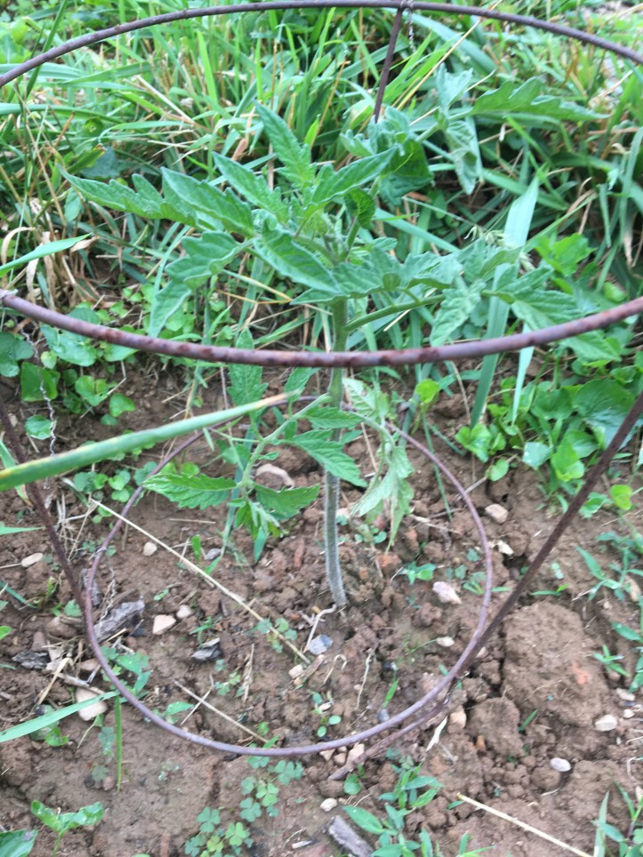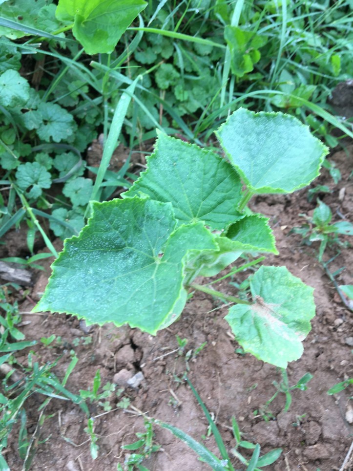 A bit of a blurry picture of one of our cucumbers who also live in Row 4, which we’re growing a little more, errr, judiciously this year. We were harvesting about ten a day at peak summer last year, so I figured it was good to cut back a bit. Two types: lemon and good old green (I think it’s Persian), with three to four plants for each. Very excited these guys came up and are doing well!