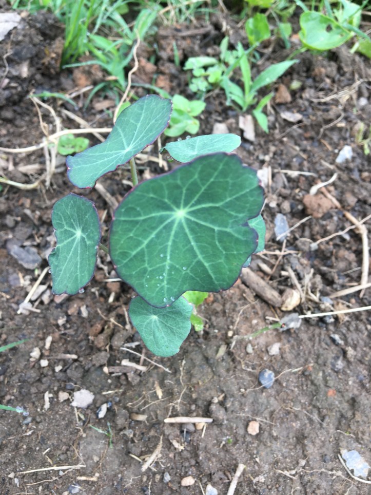 Row 6 has sunflowers, nasturtium, and cantaloupes, yay! Dumb story time: I’ve never grown nasturtium, so I didn’t know what they looked like and mixed them up with melons, thinking that the squash-looking plants growing in this row were volunteer butternut squash from our compost pile. Turns out, the five or six plants that I pulled (!) were the melons. Gahhhhh! In my defense, the melons were growing in a scattered way (rather than a neat row, like I planted them), and were a bit slow and hard to spot due to the cooler temps outside.