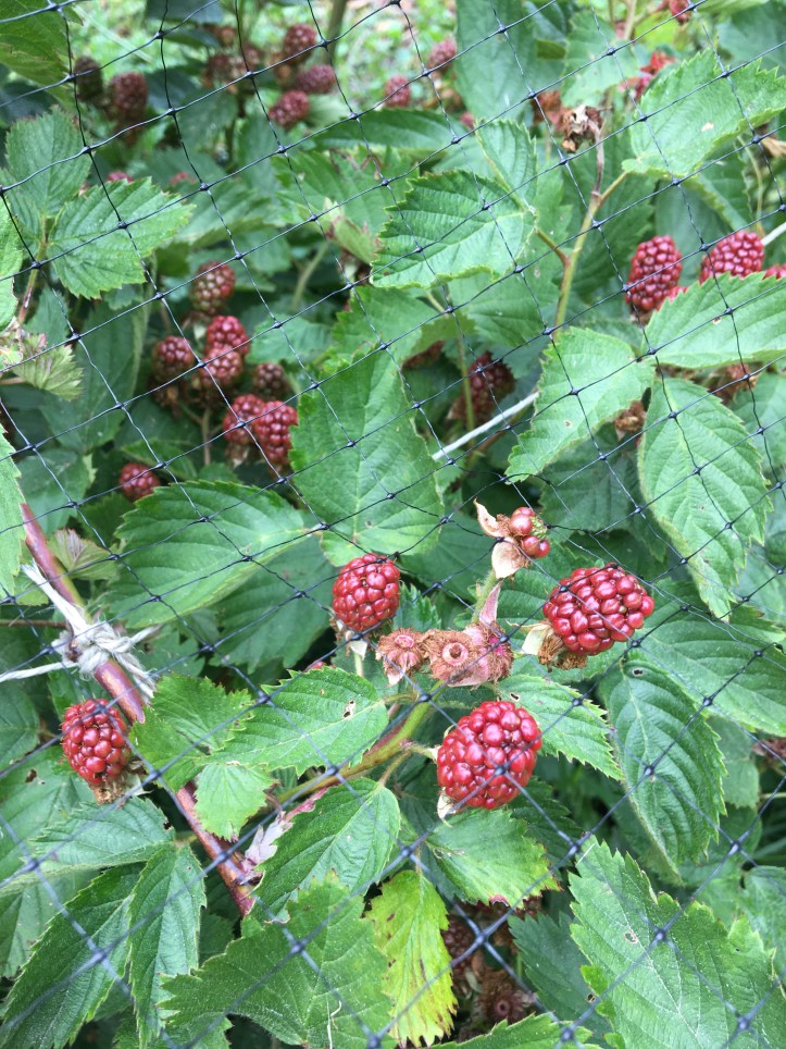 Ah, the berries. The raspberries (the pink ones) are so close to being ripe. I do thank last week’s cold spell for slowing their ripening while were were out of town, so that we can harvest and enjoy these lovelies soon while we’re here! Pictured top right is our big strawberry plant, which has given us two delightfully sweet strawberries so far, as well as has been spreading feelers like crazy in the bed, as expected. Go, strawberry, go!
