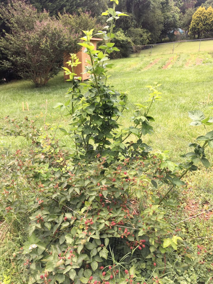 June is a busy month, as I’m sure I’ve said in the past: constant watering, weeding, pruning, and de-bugging (either with hands or a spritz of pyrethrin) of the crops, staggered companion planting, and finally, even a little bit of harvesting! Our crops are blooming and budding a bit later this year to a late frost in May, as well as a weird, cold, rainy week last week while we were gone, but copious sun and consistent afternoon showers this past week have been good for all of us.