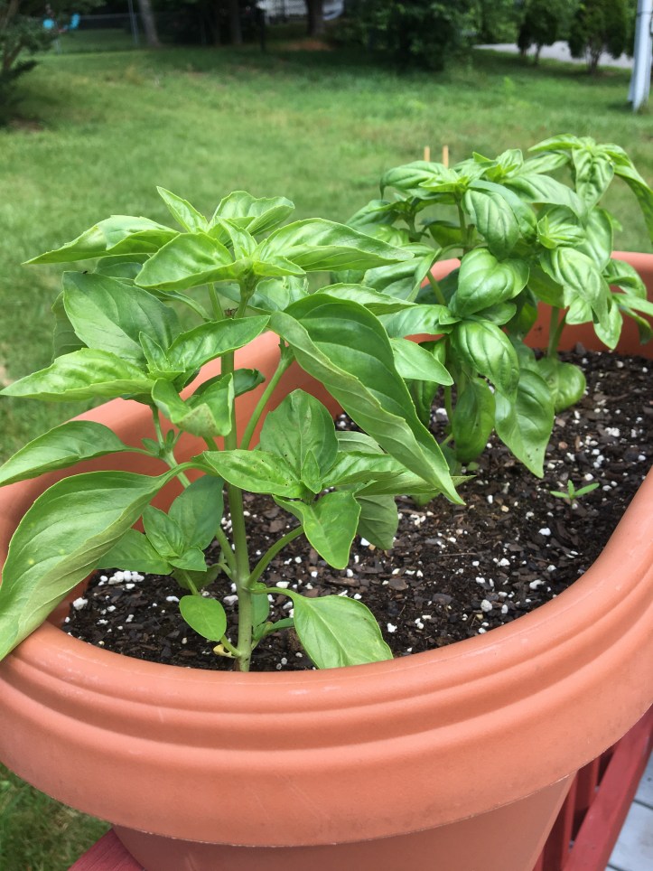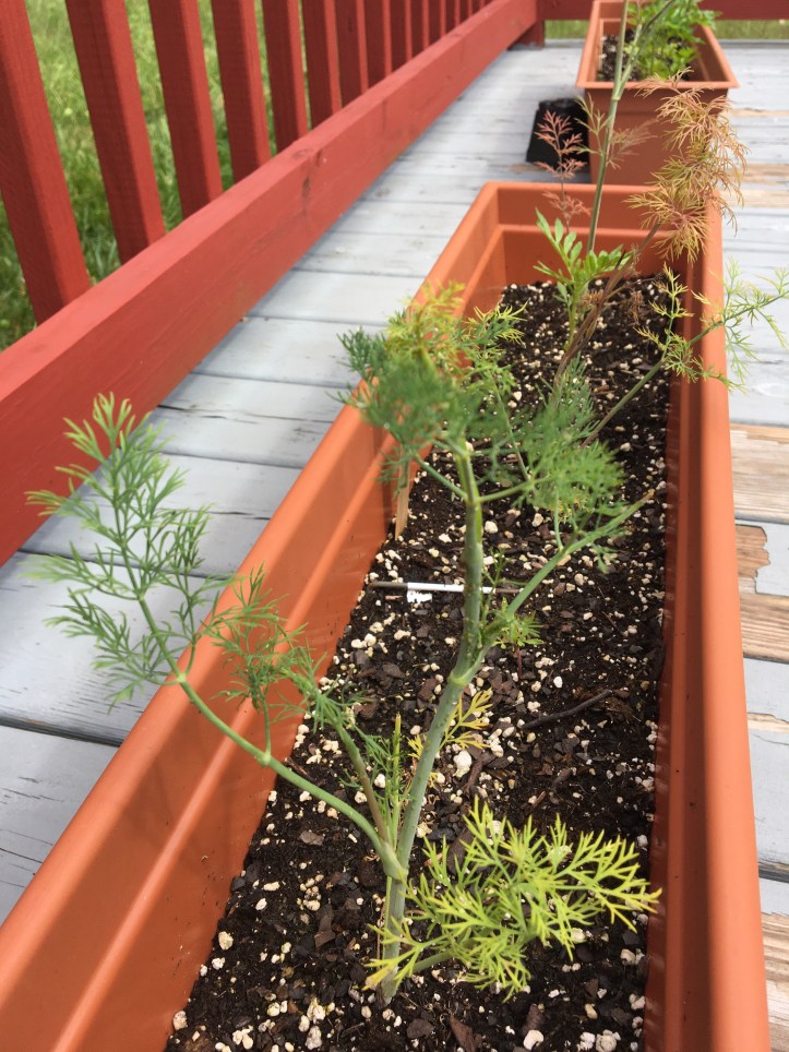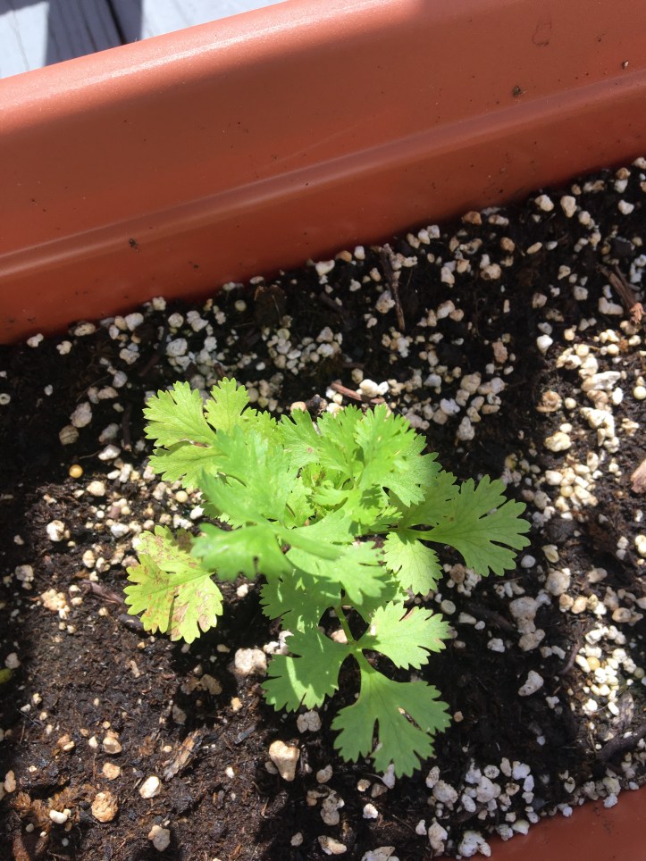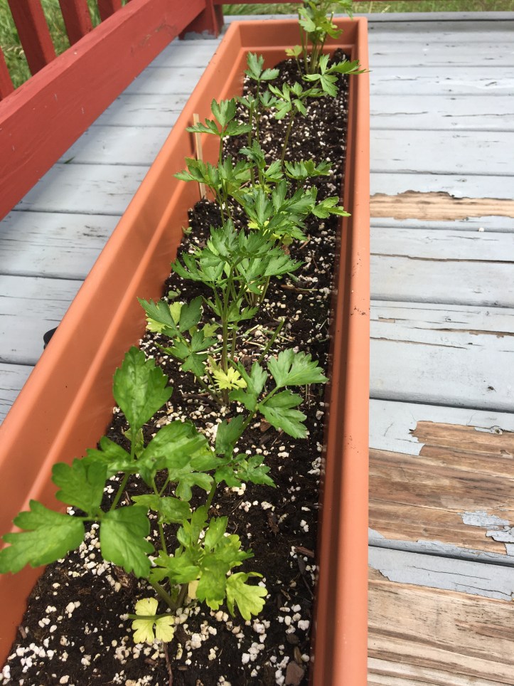 The back porch holds our extra parsley plants, for a total of nine parsley plants, because I can’t get enough of the stuff. Pictured on the left is husband’s cilantro, which is also doing quite nicely. He even got to use a sprig of it in his Thai curry the other day, and he assures me that it was delicious.