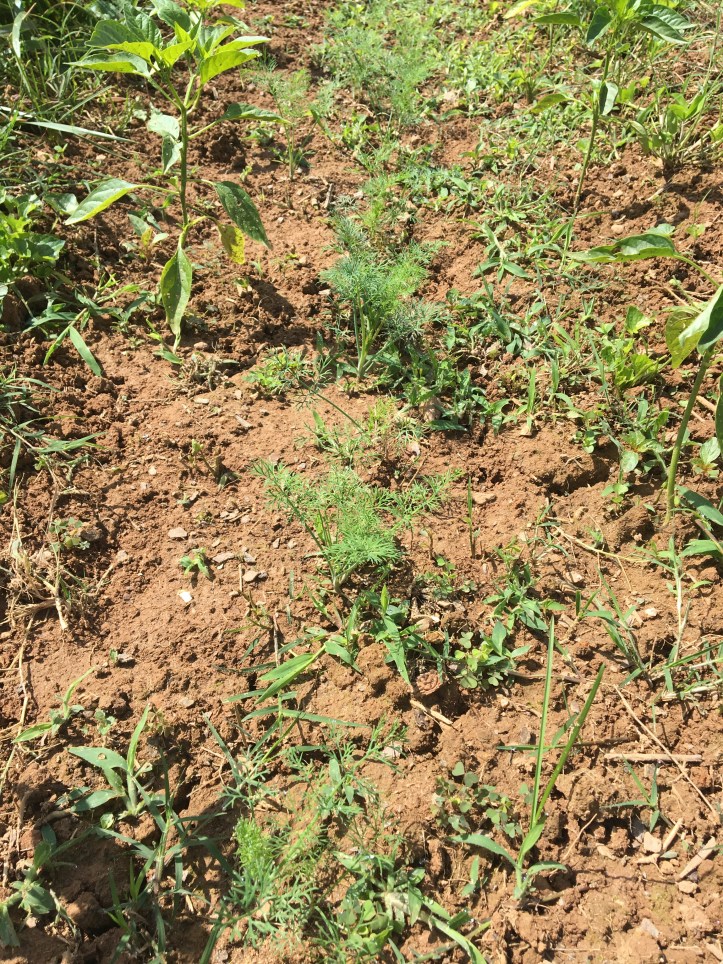 Also fun about this row are the herb seeds I planted ages ago, not actually thinking they would come up successfully. However, as I was weeding a week or so ago, I smelled the distinct scents of dill and cilantro, and realized that yes, rows of them actually came up. Yay, companion planting! I’m looking forward to dill heads for pickling, for sure.