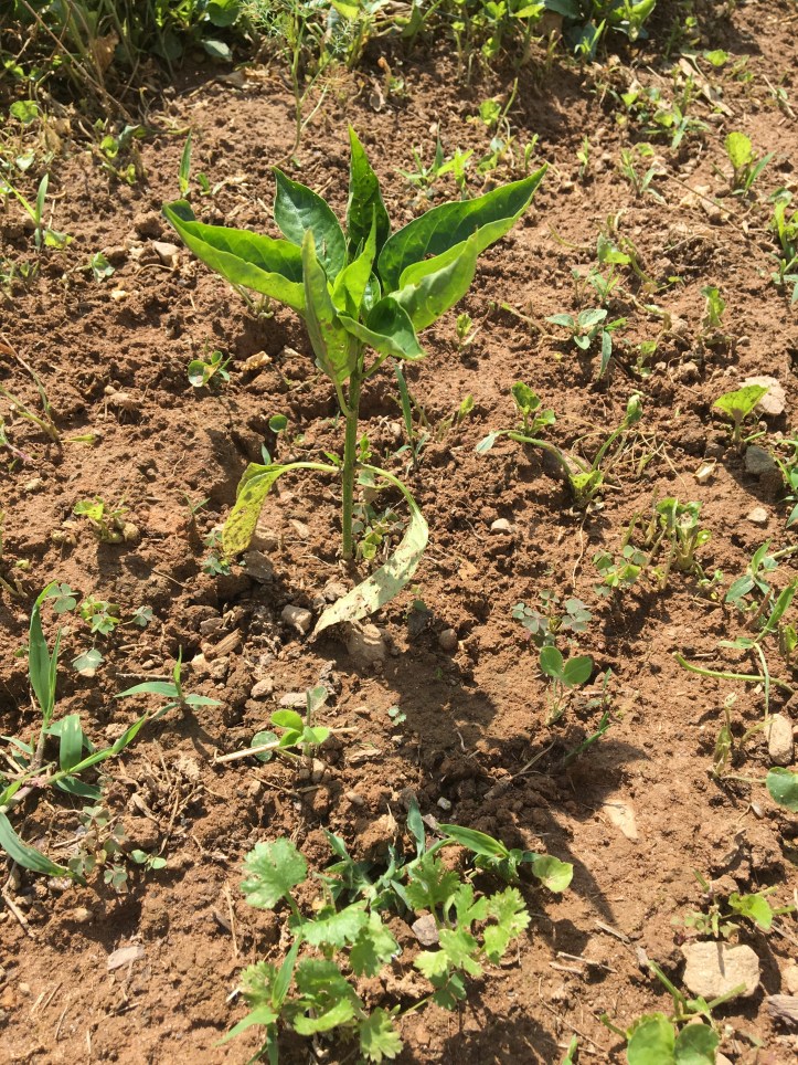 Row 5 is our exciting pepper row, and the hot weather has been good to these babies: some of our first flowers are coming in, yay!