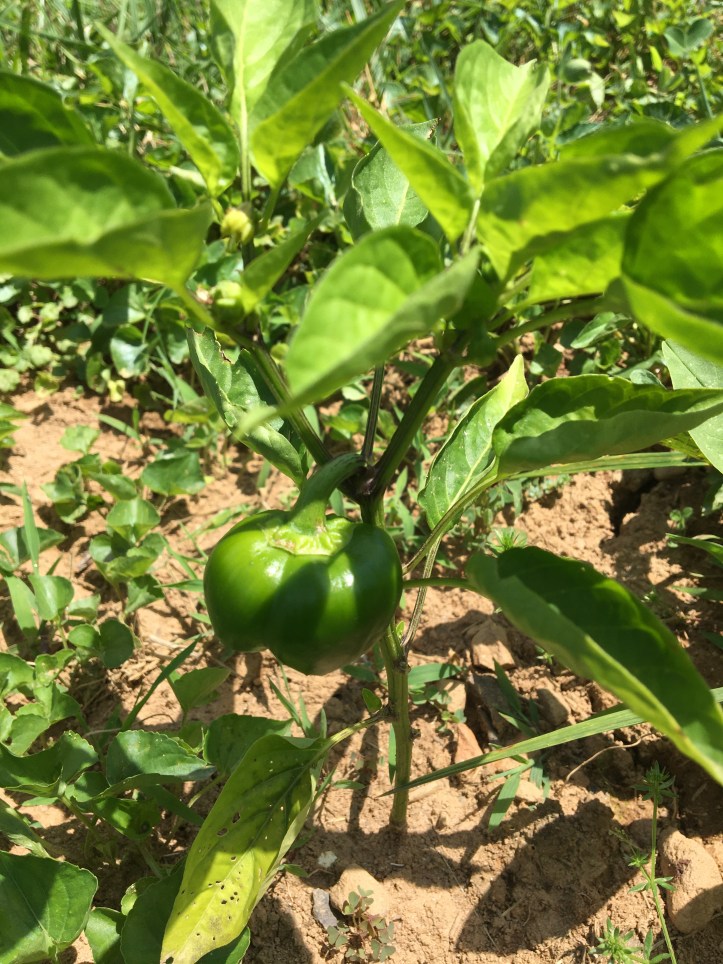 The first bell pepper, and a view of our terrible clay soil. Grow grow grow!