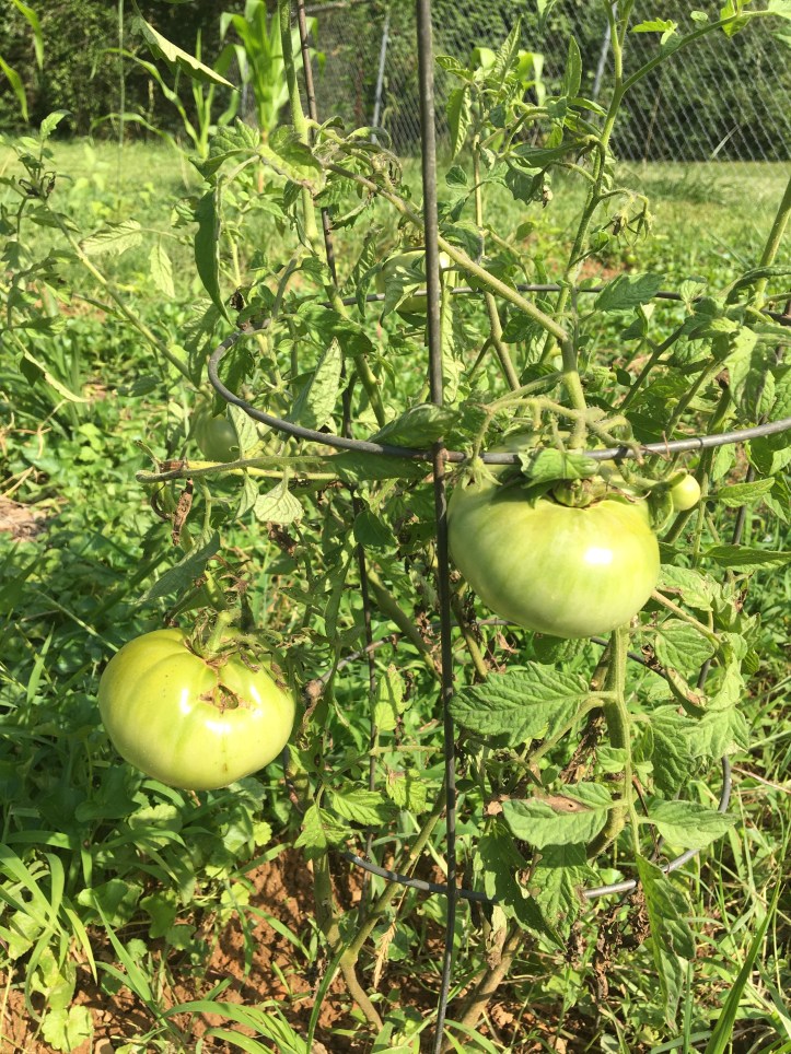 So, our squash and tomatoes have been a bit hit-or-miss so far this year. Because of the excessive rain, we’ve had a problem with blossom end rot on some of our tomato specimens (including our first ripe Cherokee purple today, alas!). However, some of our tomatoes, especially the Roma pictured (the last one), are exploding with bounty. I’m thankful for whatever we get!