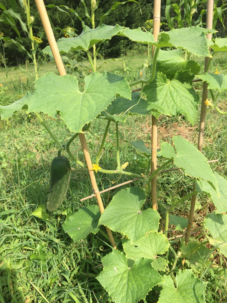 Meanwhile, our cucumbers are doing fabulously! They’re late, but they were planted late, and because I actually trellised them before they went wild, I’m able to find them and keep them from rotting on the ground. I say that, but the last lemon cucumber picture was hidden in the tall grass. (I found it, didn’t I?)