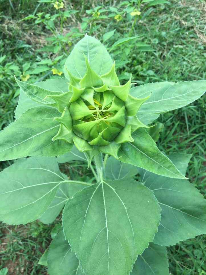 Our first sunflower opened up this week! It’s nearly the size of my head, and it’s gorgeous. Pictured is another sunflower just about ready to open up in the same row. Grow, sunflowers, grow! (And help the melons grow, while you’re at it.)