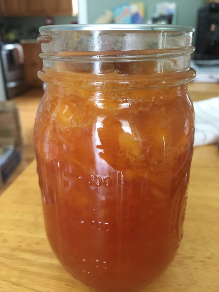 So today, I’m giving you two recipes for the price of one: peach jam, and peach butter. What’s the difference, you ask? Peach jam generally uses more sugar, and needs a thickener, such as pectin, or a long cooking time with lemon juice (a smaller, less concentrated form of pectin), to form. Jam generally has chunks or larger pieces of fruit, is sweeter because of the higher sugar content, and retains more of the fresh fruit color.