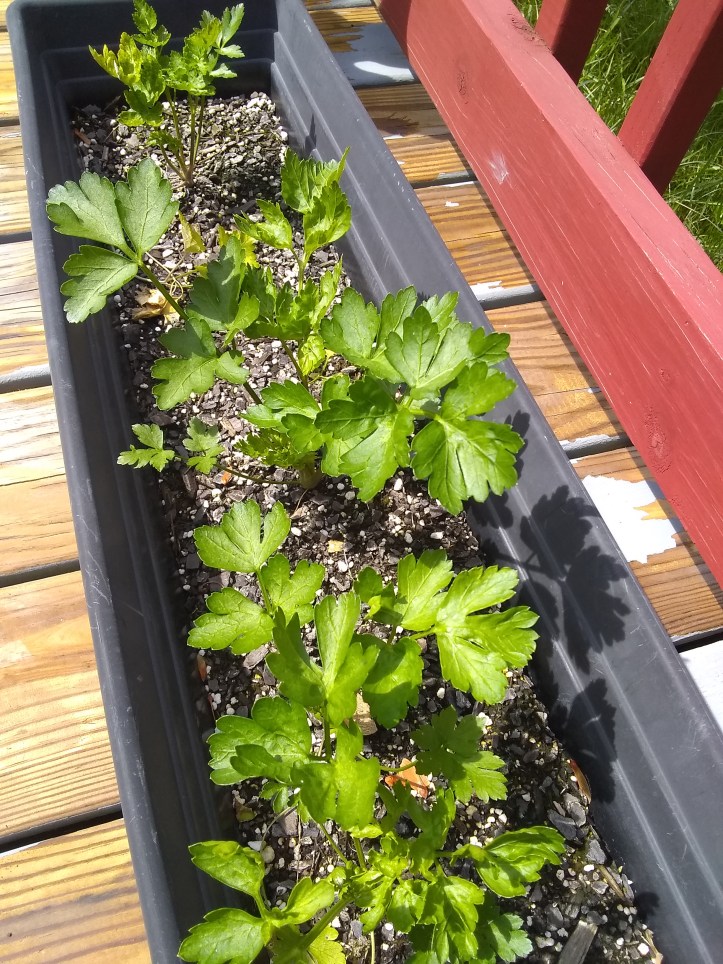- Our porch garden is booming – Genovese and Thai basils, arugula, lettuce, parsley, oregano, sage, thyme, mint, peppers, tomatoes, marigolds, cilantro, and dill are planted and/or coming up as perennials from years past.