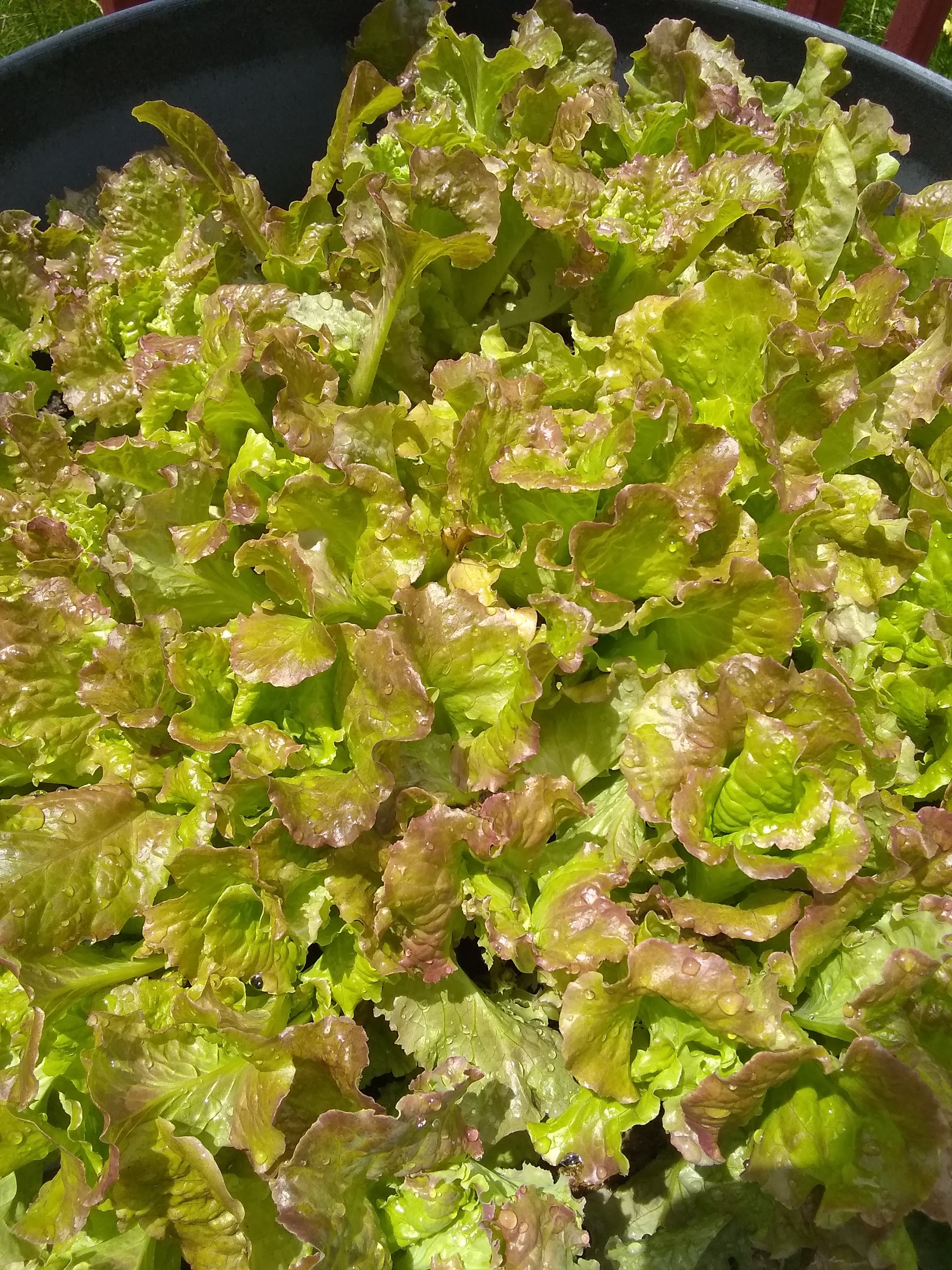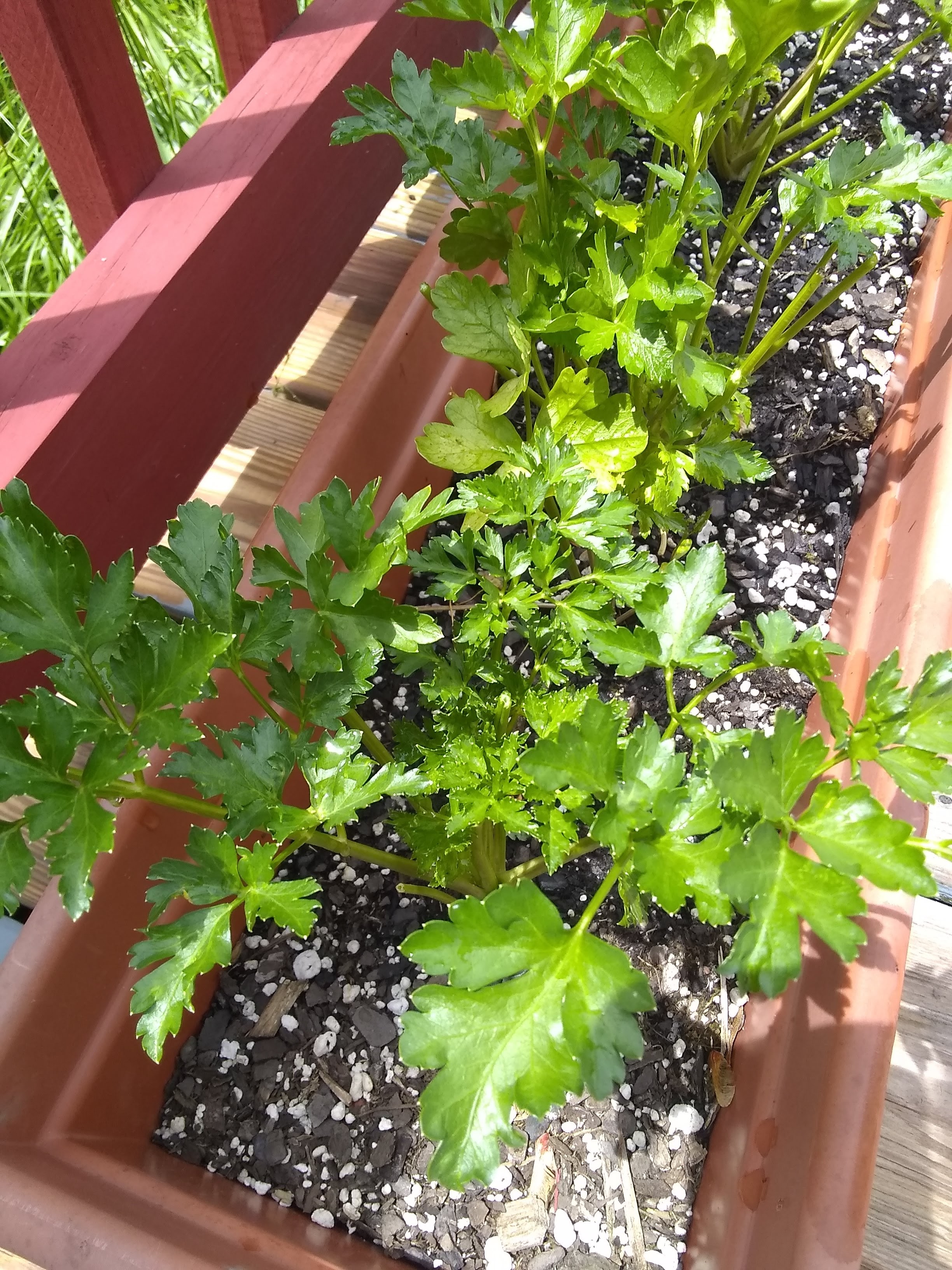 Our herbs are doing beautifully! We have more than is pictured (including sage, thyme, mint, and oregano from years past that have faithfully returned), and are looking forward to fruits from the potted Cherokee purple tomato plant and potted (banana?) pepper plants within the next month or so. Also, the type of lettuce pictured is called Drunken Woman, and, besides having an amusing name, produces pretty tasty lettuce even through some of the summer temperatures, so we’ll be keeping to this variety for years to come, methinks.