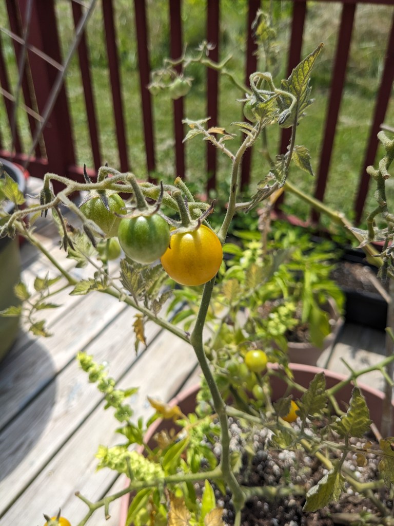 Our porch plants are doing fabulously, yay! We’ve gotten a few eggplants so far, lots of cherry tomatoes (which Toddler Homesteader loves to pick and eat most of), herbs for our own cooking as well as market baked goods, and even a few hot peppers.
