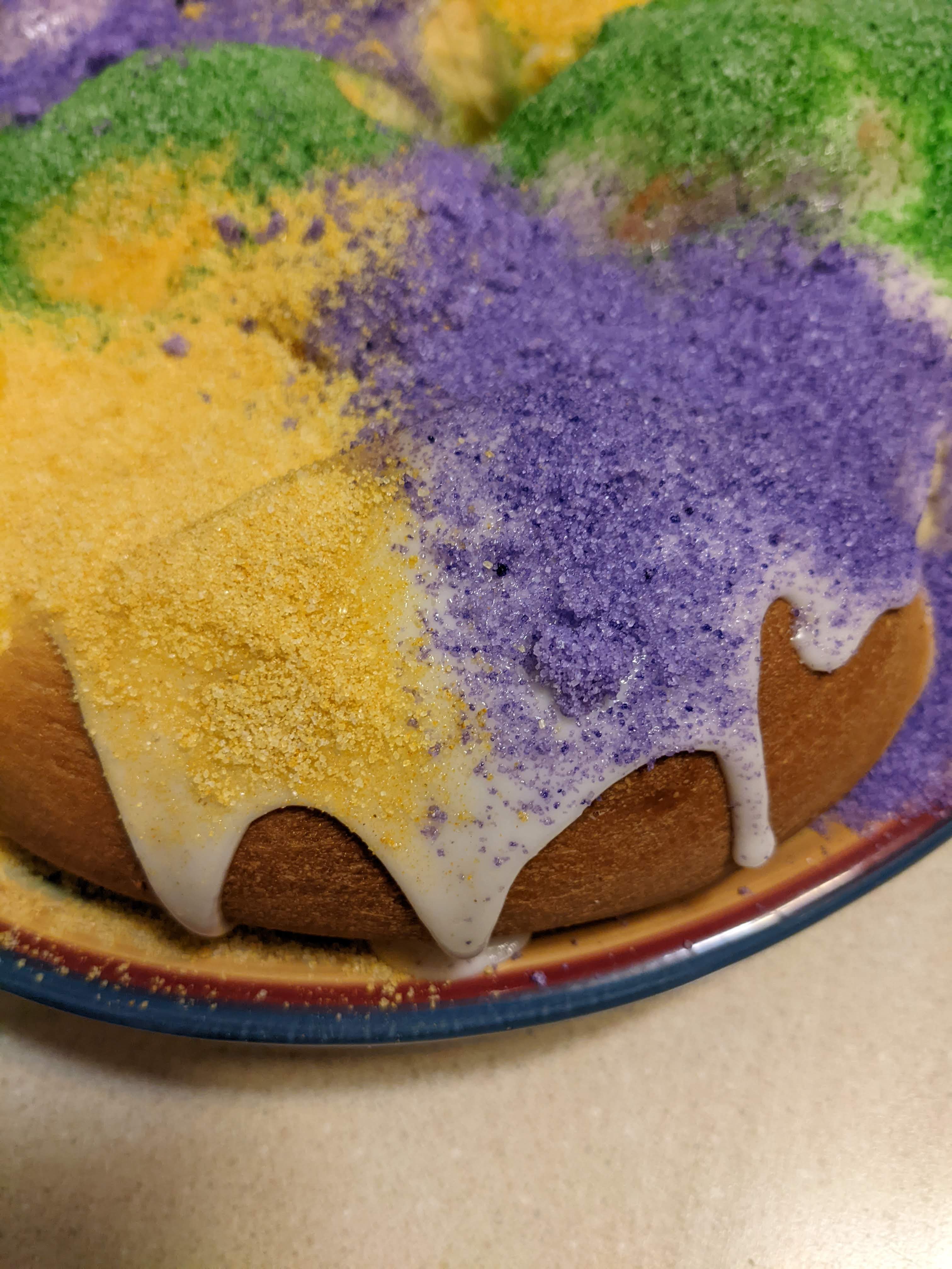 The cake is *gasp* unfilled, which I was skeptical of at first (aren’t all king cakes filled with something?!), but its simplicity is what makes it stand out. Plus, I got high praise from a native New Orleansian (or however you say it), so I’m sticking to my recipe.