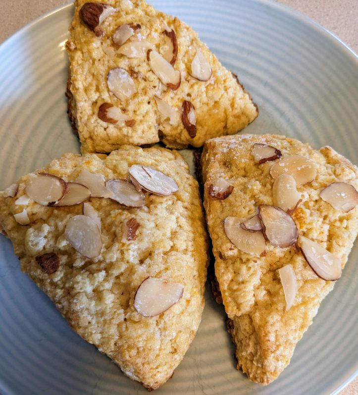 Enter the orange almond scone. Not quite the orange cranberry or orange spice of the holidays and winter, it’s lightly sweet, with a bit of zest tang and bitterness complementing the fruitiness of almonds and orange juice. They’re just fabulous with a piping hot mug of Earl Grey tea.