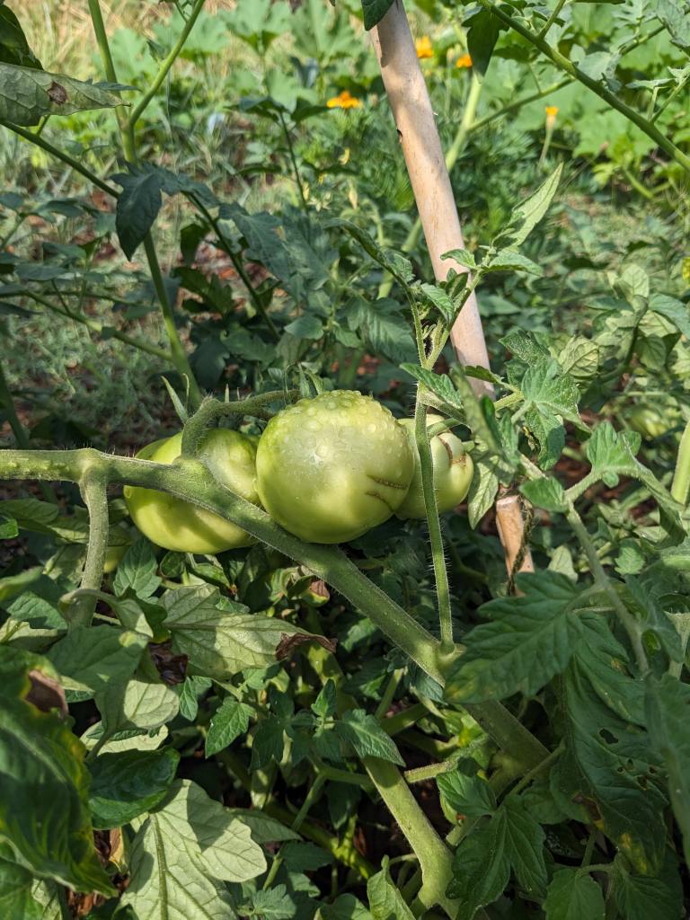 We’ve been getting a decent number of green beans and cucumbers so far this year, although the heat has stunted some of the cukes this month. Tomatoes are juuuuuust starting to ripen now, and we’ve enjoyed the first few ripe cherry tomatoes this week.