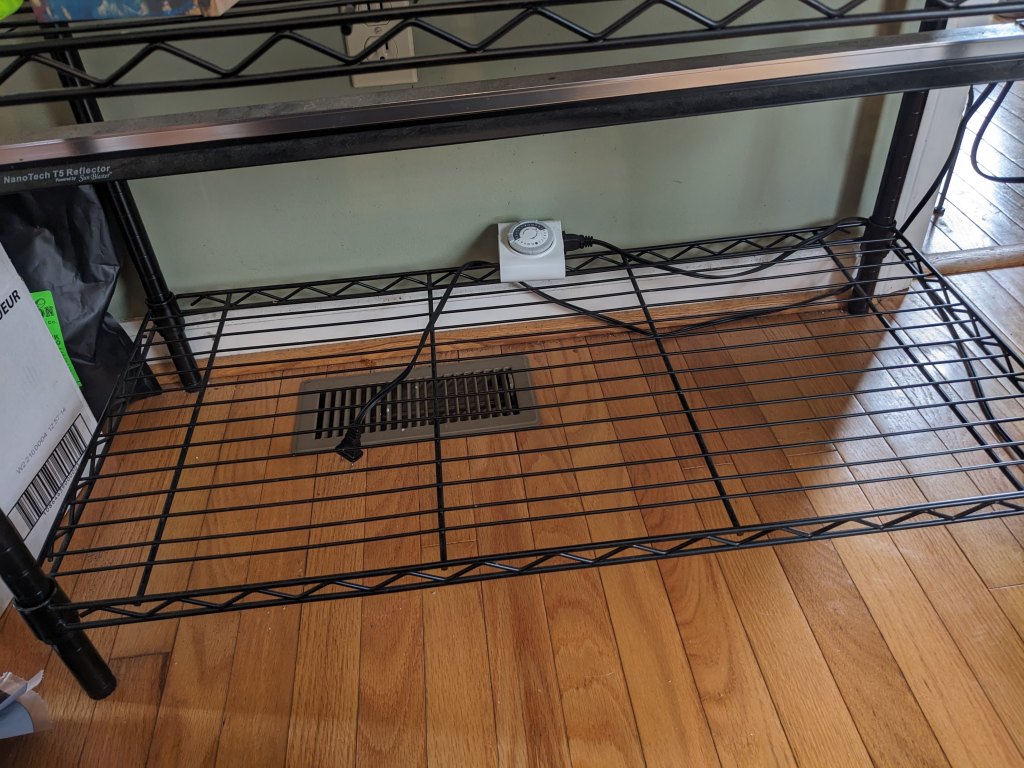 We use small metal pantry shelves (they hold a good deal of weight, and cost about $30-40), and tie the grow lights above the seed trays using zip ties. We also use a plug timer, so that we don’t have to remember to turn the lights on and off, and we can control the number of hours of daylight the plants get.